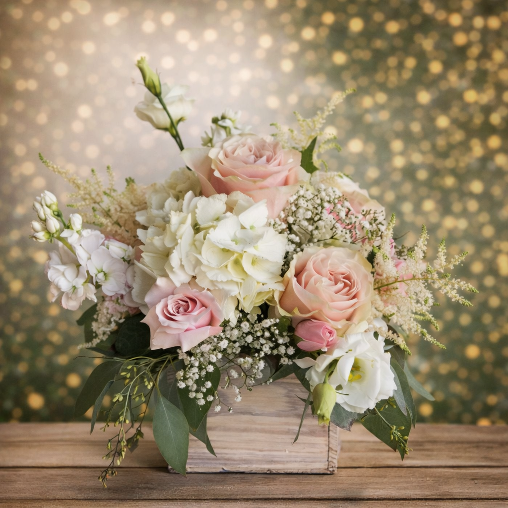 This elegant floral arrangement blends blush pink roses, creamy white hydrangeas, lisianthus, baby’s breath, and fresh greenery in a charming rustic wooden container. Designed in a soft pastel palette, it creates a romantic and timeless look that complements any occasion.